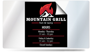 - Use White/Bright Letters If Using a Transparent Decal On a Window or Glass Surface - If you are planning on having your business hours sign be vinyl lettering, a clear window decal, or a clear static cling, we recommend making the color of the text on your sign as bright as possible (with white being the best option). This allows maximum visibility, making your hours stand out and be easily read. Many times, if a dark color is used (such as black), the letters blend in with the background of the window/glass surface and cannot be read, especially when the windows may be tinted. However, if you are using any other type of sign or decal (such as aluminum, opaque window decal, plastic, etc.) the only thing you need to consider is to make sure the background of your sign contrasts with the letters. For example, if you are ordering an aluminum sign and want the background color to be white, be sure to use a dark color for your letters (such as black).