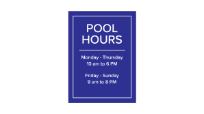 - Pool Hours - Keep swimmers out of your pool and let them know when to come back with pool hours signs. If you want to enforce your pool hours even further, consider adding a video surveillance sign as well. Besides posting the hours of operation, you can also include warning messages such as “No Swimming After Dark” or “Do Not Use Pool When Closed”. There are few regulations around the size and lettering height for these signs. We recommend making them a size that can be easily seen and read and placed at each entrance to your pool.