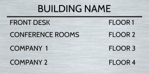 Elevate the look of your office with brushed aluminum signs made from 3 mm brushed aluminum e-panel material. These are fully customizable and great for displaying reception areas, lobbies, hallways and more. Read More